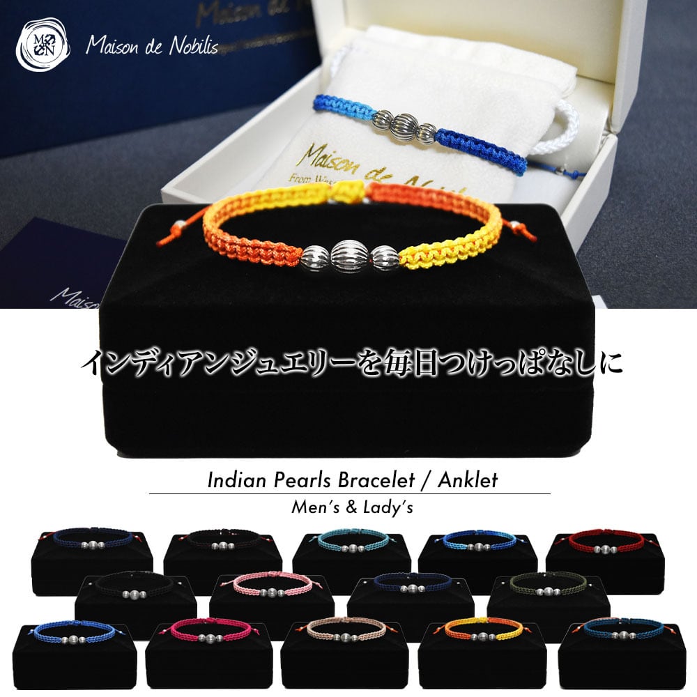 ヴィンテージ感のある質感とシルバー細工特有の存在感が魅力的なナバホパールをアクセントに、Maison de Nobilisが得意とするカラーバリエーション豊富な編み込みコードアクセサリーに昇華し24時間着用可能なブレスレット、アンクレットに仕上げました。