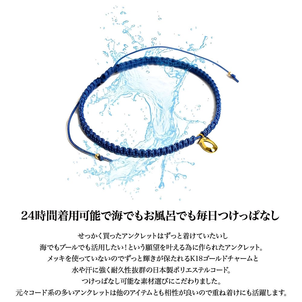高級金属のK18ゴールドをチャームに採用し、海やプール、シャワーなど、24時間着けっぱなしでもOKです。