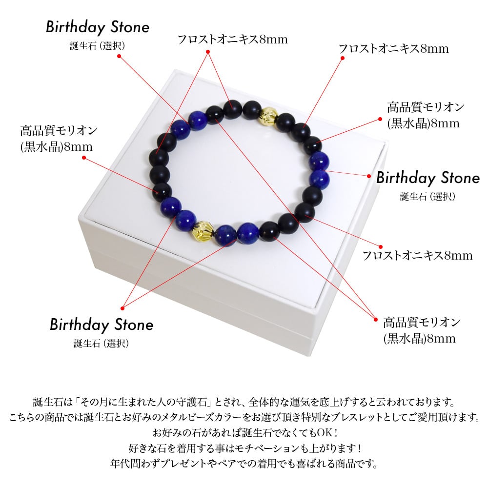 ブラックを基調としながら左右でテイストの違う石を配置し、ゴールドと誕生石をアクセントにしたこだわりのデザインをベースにしながら誕生石をお選び頂けます。