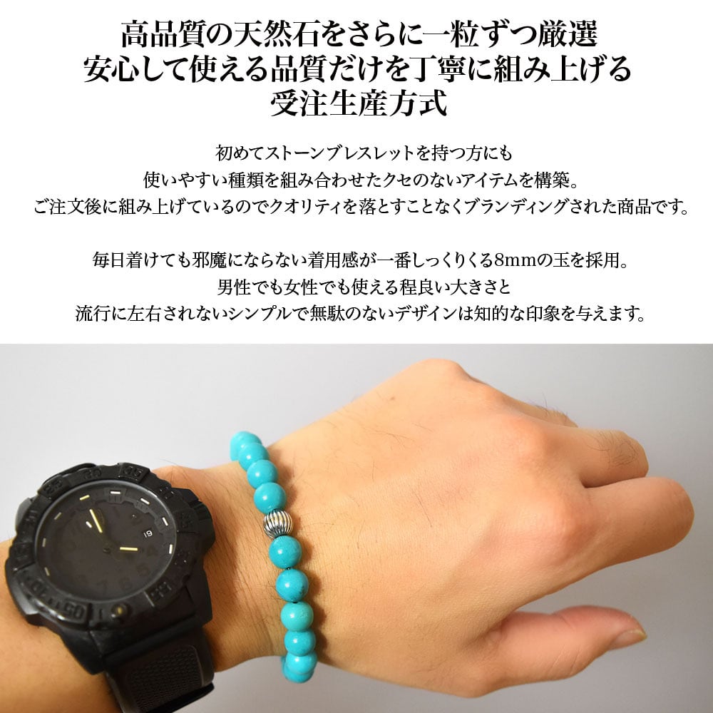 仕事、デート、休日ファッション全てに対応。天然石特有の質感が子供っぽくならず時計やバングル、コードブレス等との重ね付けもしやすい。