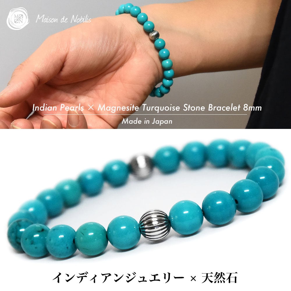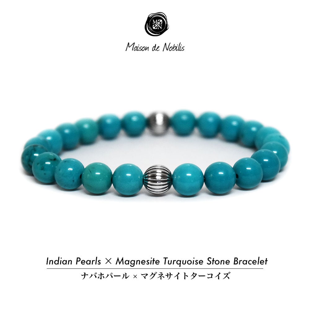 【インディアンジュエリー×天然石】Indian Pearls × Magnesite Turquoise Stone Bracelet【品番 26S2013】