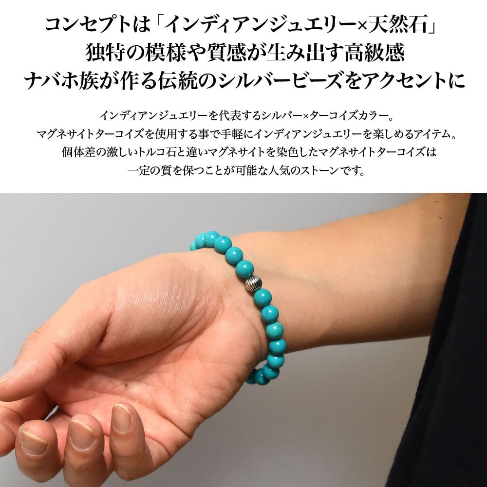 マグネサイトターコイズを使用する事で手軽にインディアンジュエリーを楽しめるアイテム。