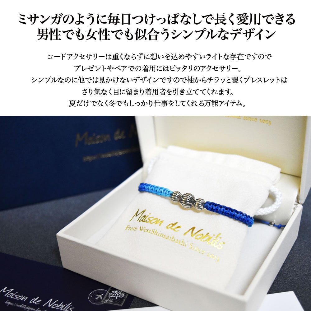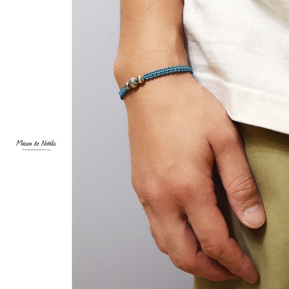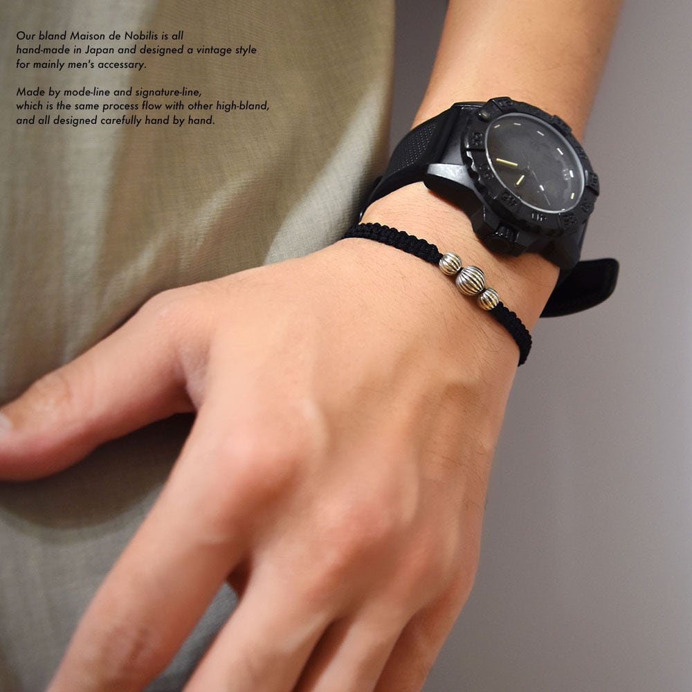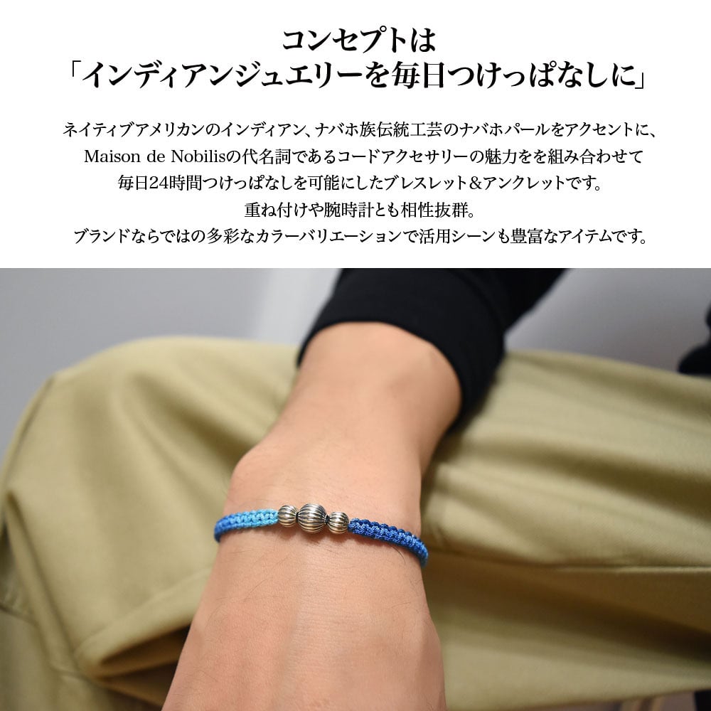 ヴィンテージ感のある質感とシルバー細工特有の存在感が魅力的なナバホパールをアクセントに、Maison de Nobilisが得意とするカラーバリエーション豊富な編み込みコードアクセサリーに昇華し24時間着用可能なブレスレット、アンクレットに仕上げました。