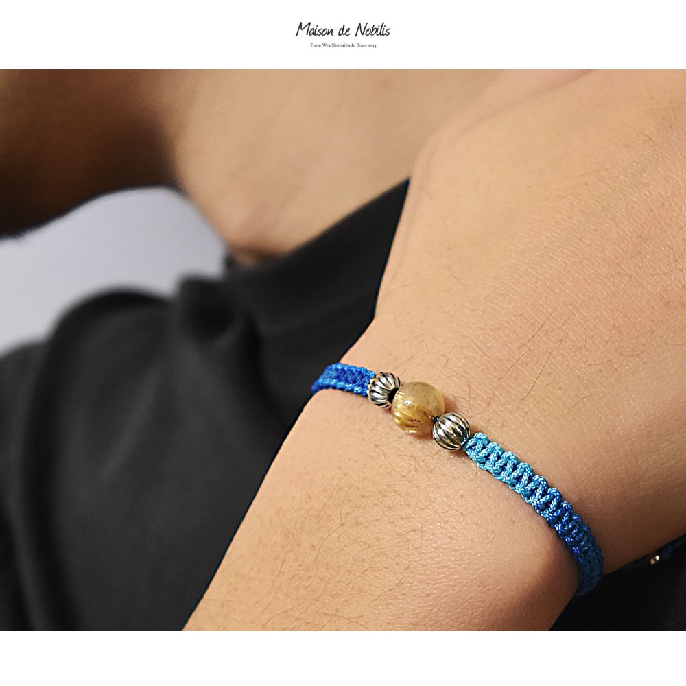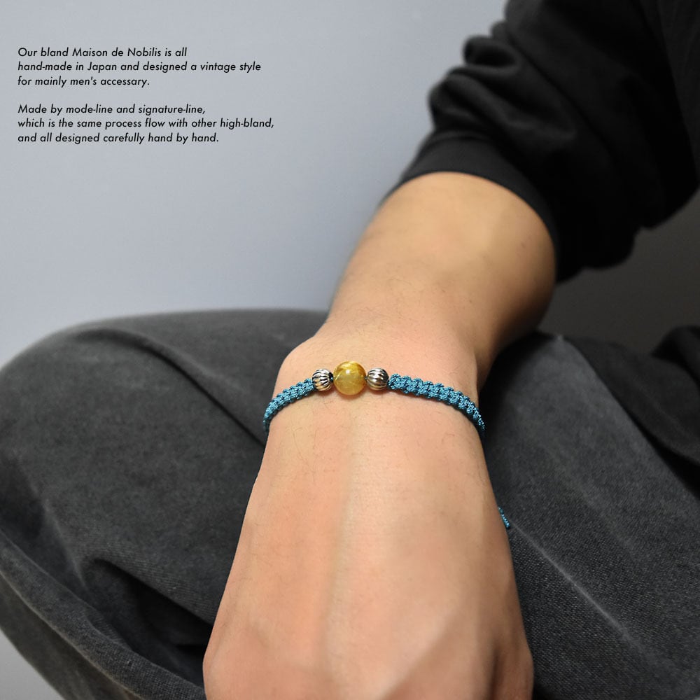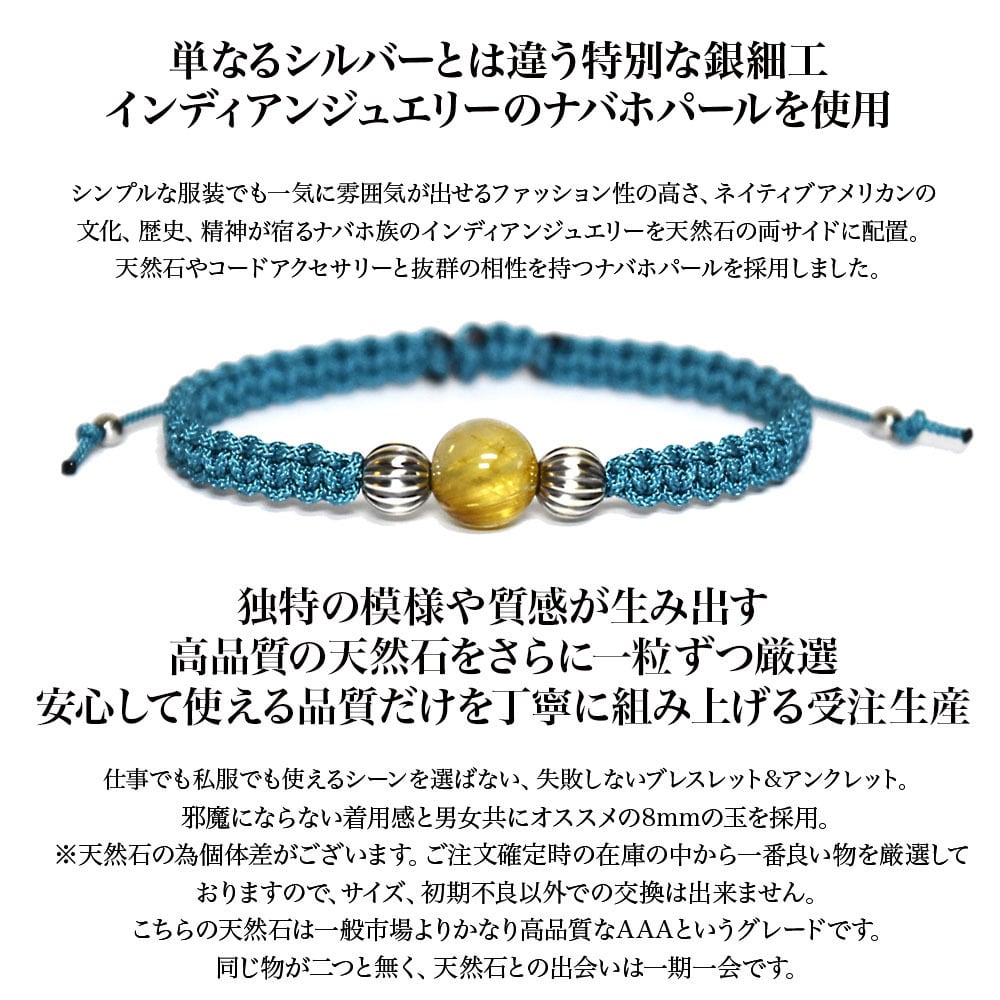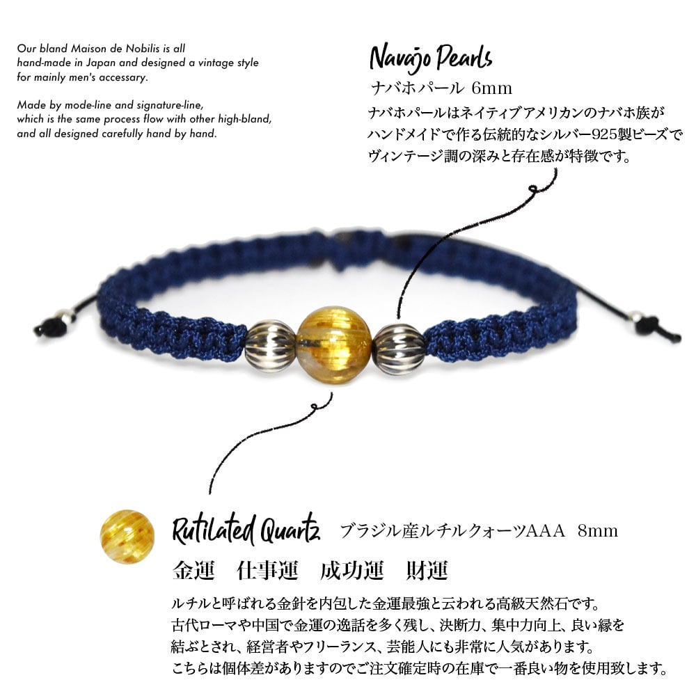 ルチルクォーツをベースにネイティブアメリカンのナバホ族がハンドメイドで作るシルバービーズ、ナバホパールをアクセントに、Maison de Nobilisが得意とするカラーバリエーション豊富な編み込みコードアクセサリーに昇華し24時間着用可能なブレスレット、アンクレットに仕上げました。