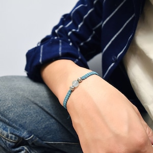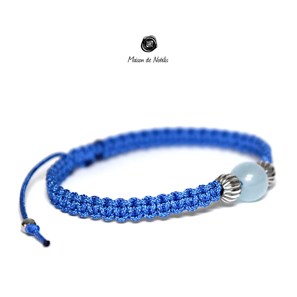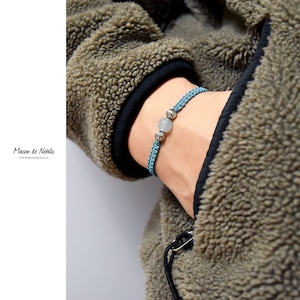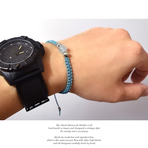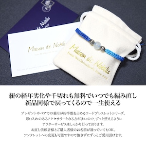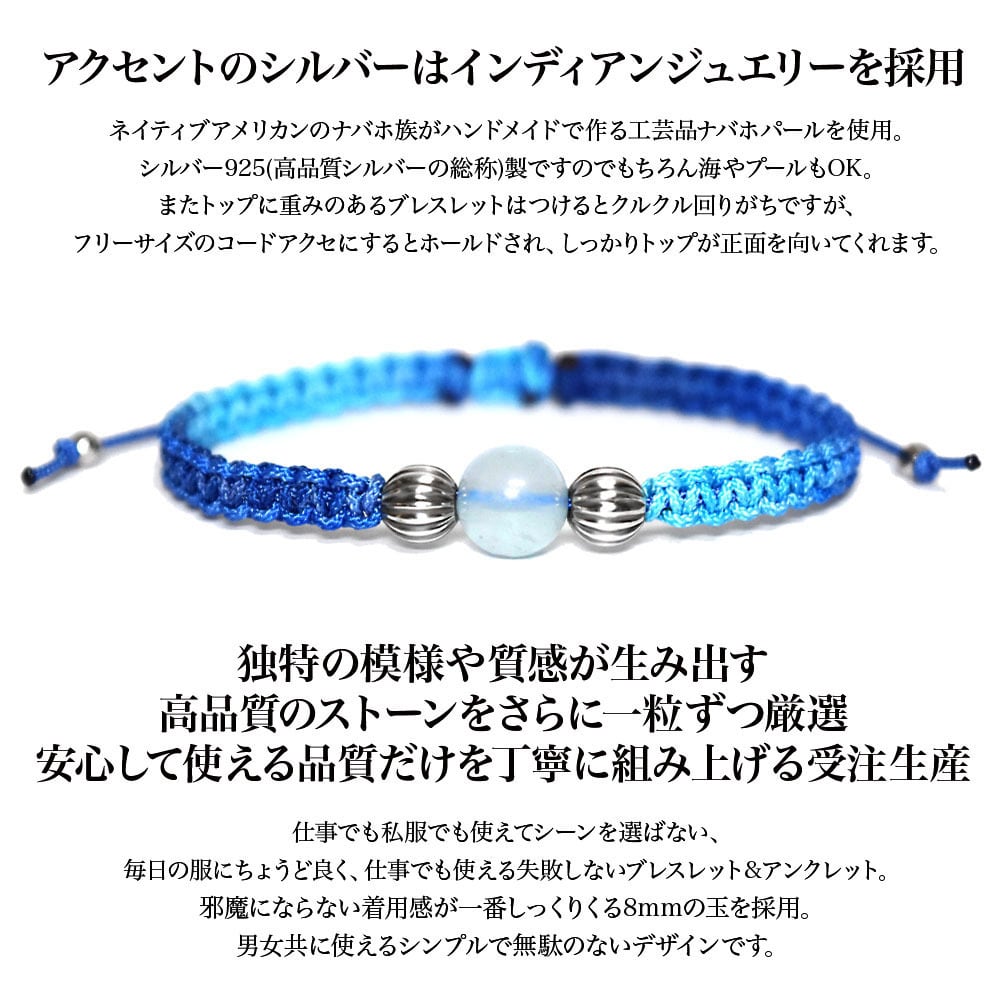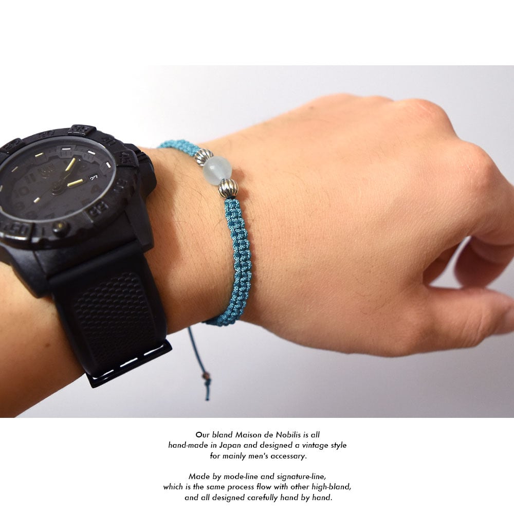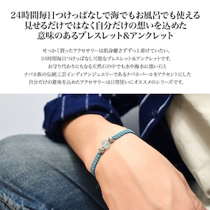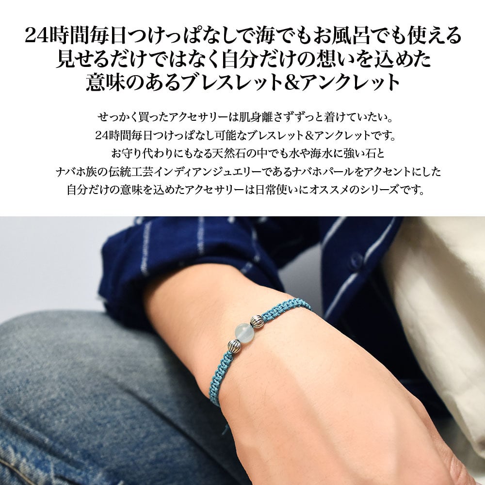 アクアマリンをベースにネイティブアメリカンのナバホ族がハンドメイドで作るシルバービーズ、ナバホパールをアクセントに、Maison de Nobilisが得意とするカラーバリエーション豊富な編み込みコードアクセサリーに昇華し24時間着用可能なブレスレット、アンクレットに仕上げました。
