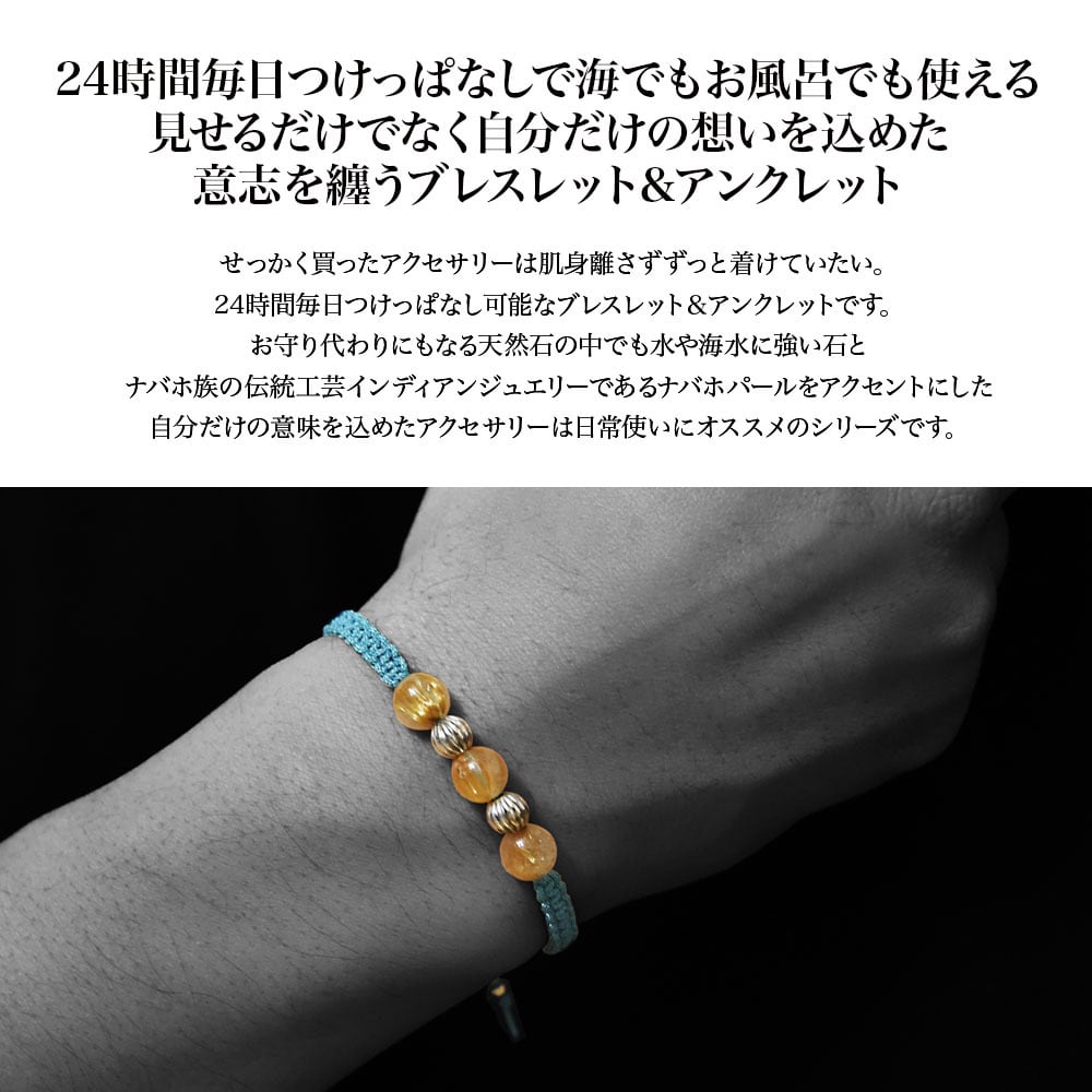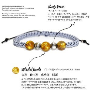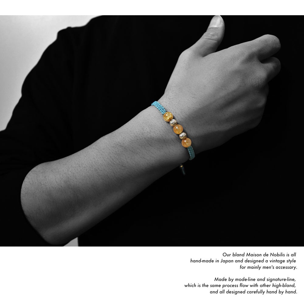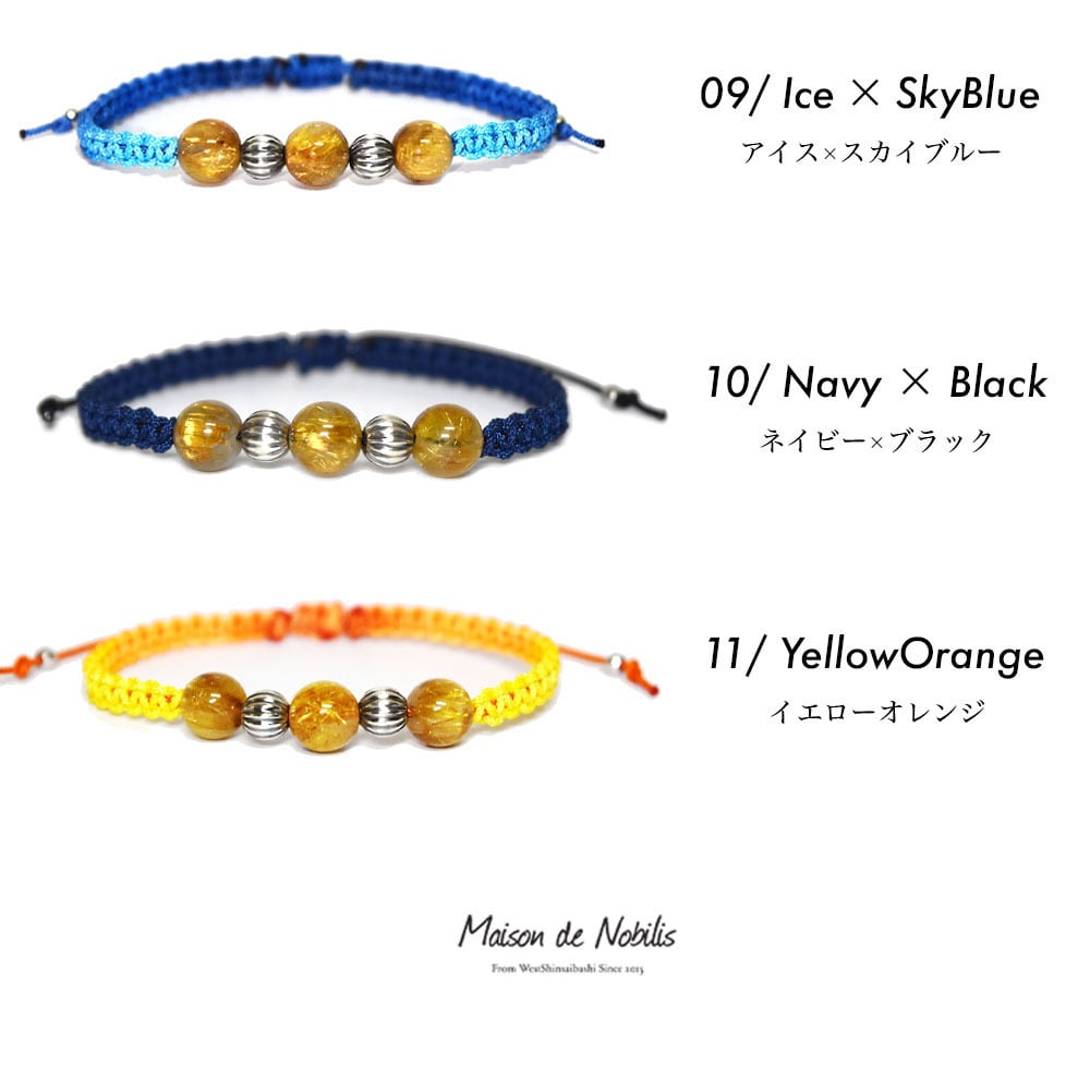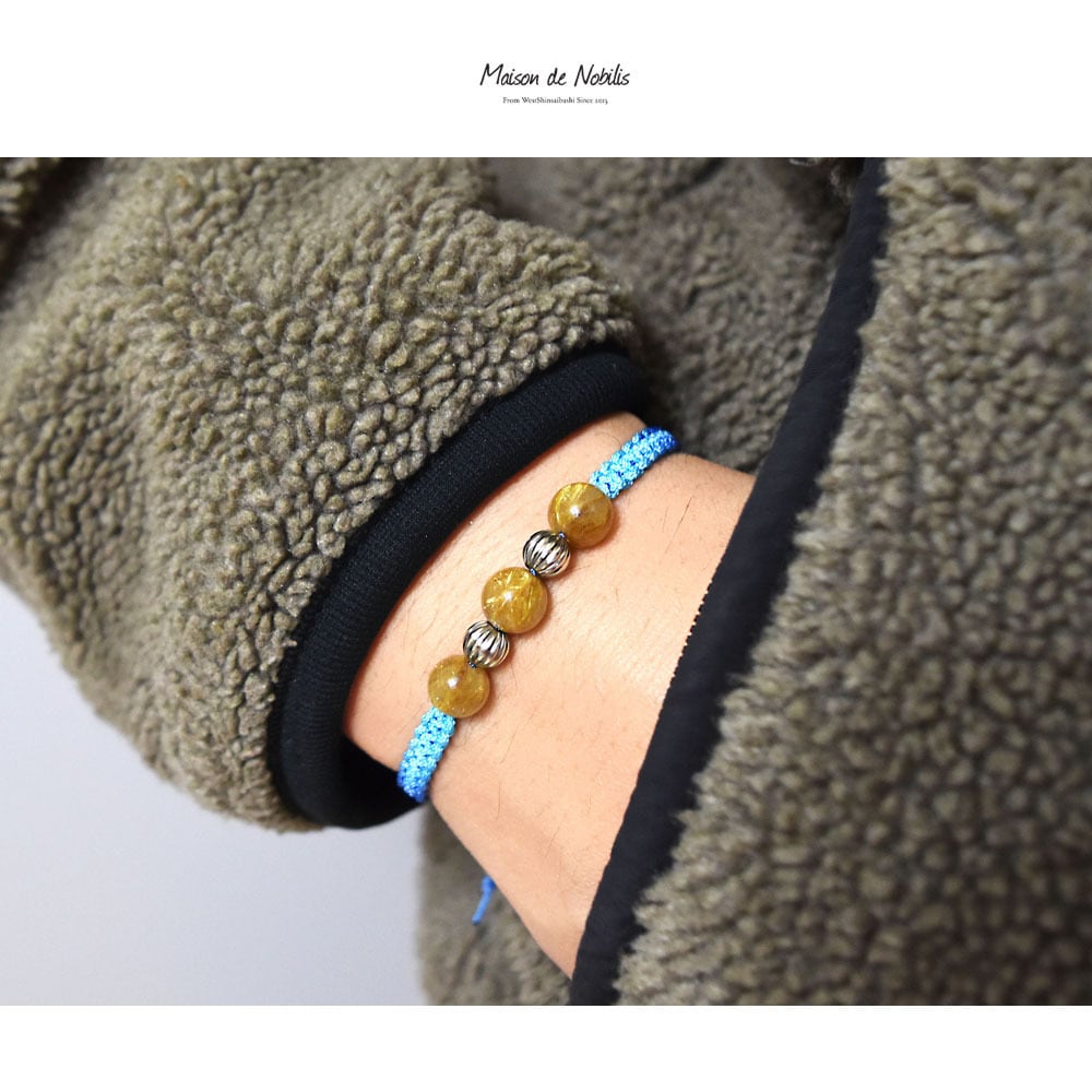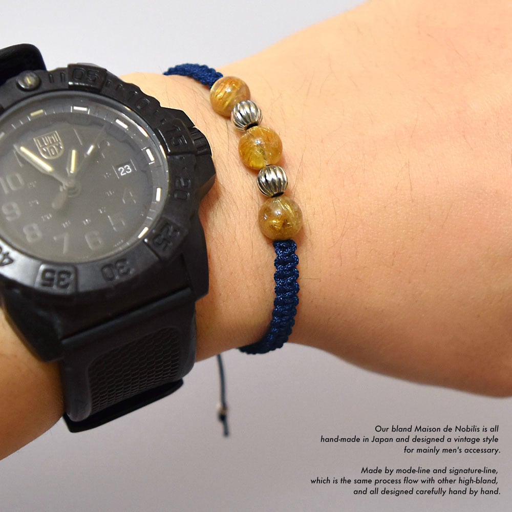 ルチルクォーツをベースにネイティブアメリカンのナバホ族がハンドメイドで作るシルバービーズ、ナバホパールをアクセントに、Maison de Nobilisが得意とするカラーバリエーション豊富な編み込みコードアクセサリーに昇華し24時間着用可能なブレスレット、アンクレットに仕上げました。