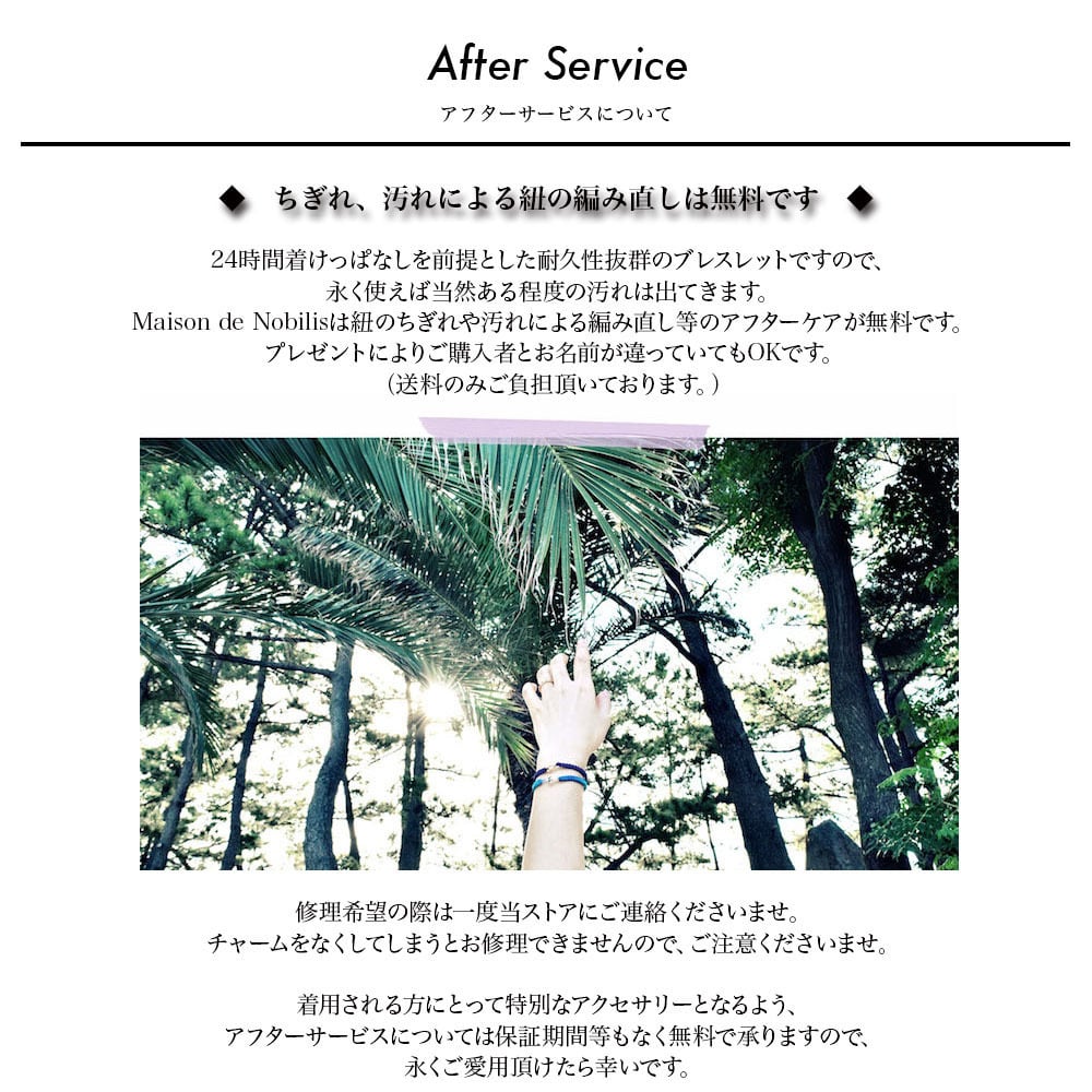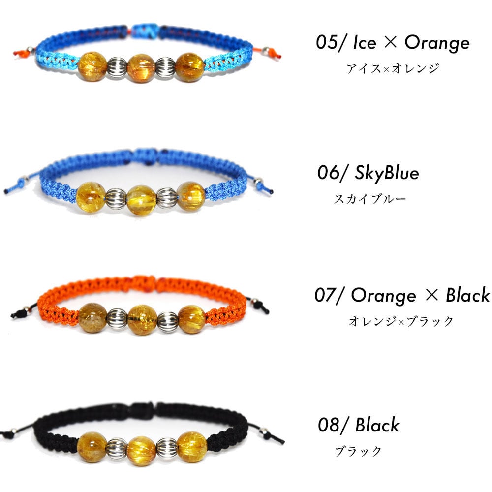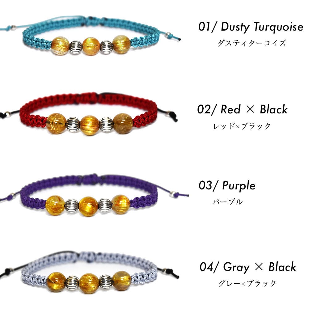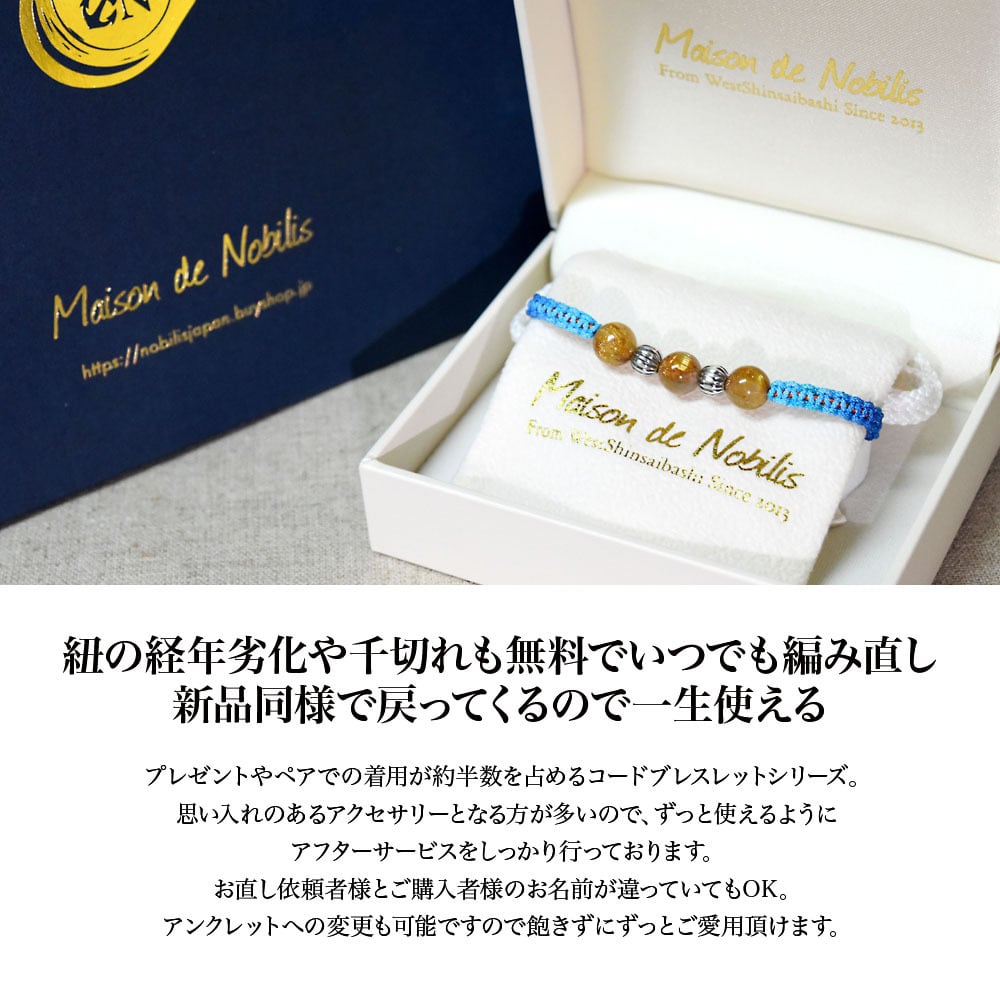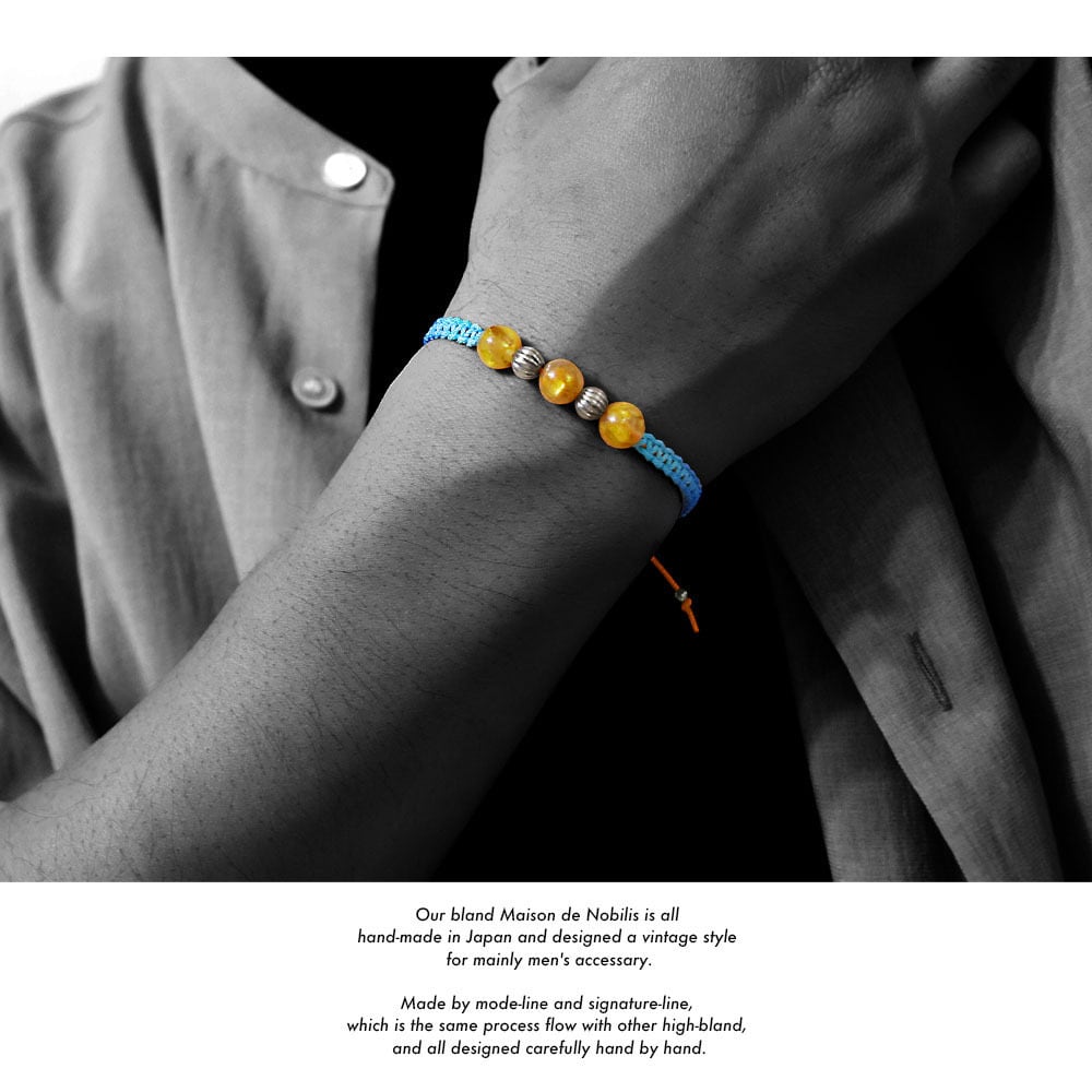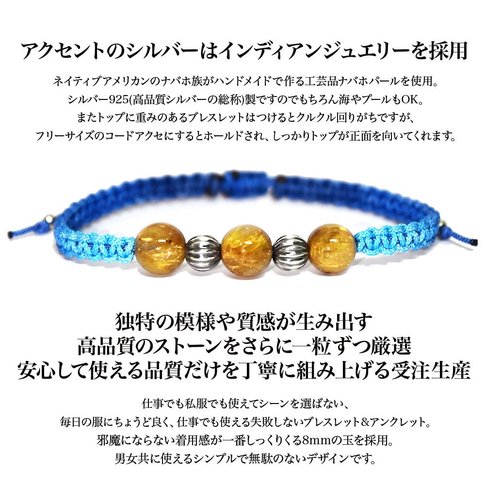 ルチルクォーツをベースにネイティブアメリカンのナバホ族がハンドメイドで作るシルバービーズ、ナバホパールをアクセントに、Maison de Nobilisが得意とするカラーバリエーション豊富な編み込みコードアクセサリーに昇華し24時間着用可能なブレスレット、アンクレットに仕上げました。