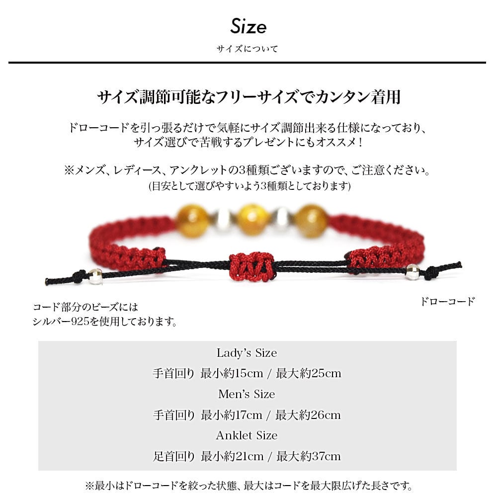 サイズはフリーでレディースブレスレットサイズ、メンズブレスレットサイズ、アンクレットサイズの3種類ございます。
