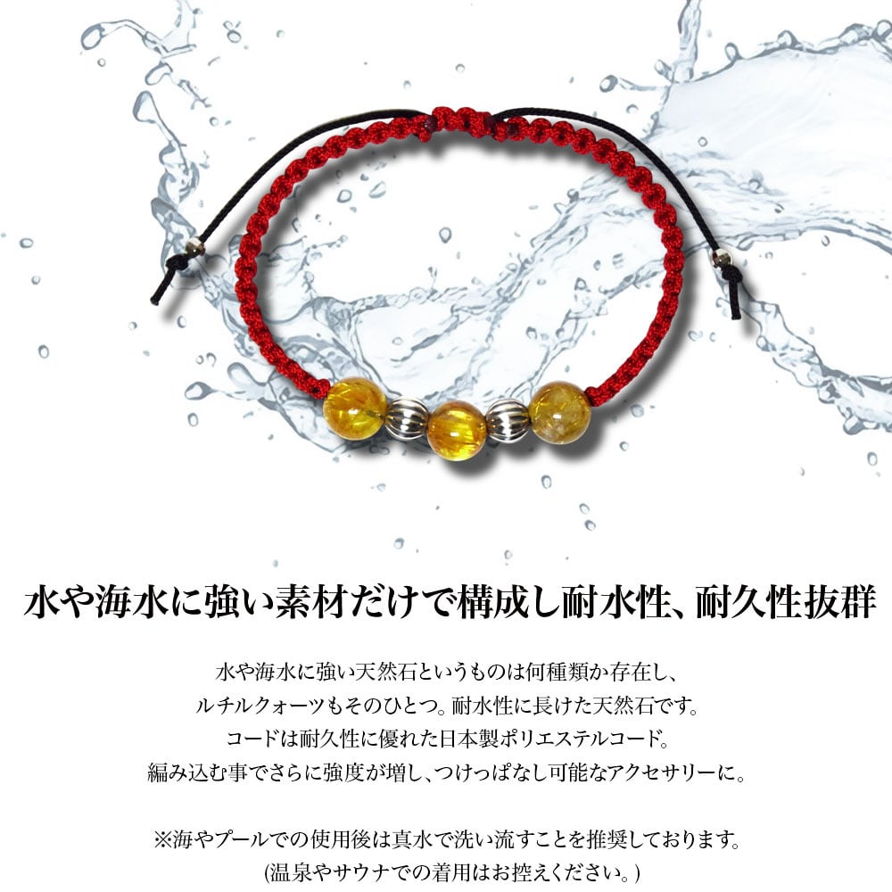 基本的にストーンブレスレットは海やお風呂での着用はできませんが、水や海水に強い天然石というのも存在します。ルチルクォーツもそのひとつ。見せるだけでなく持つ事に意味があるのでプレゼントやペアでの着用にもオススメ。