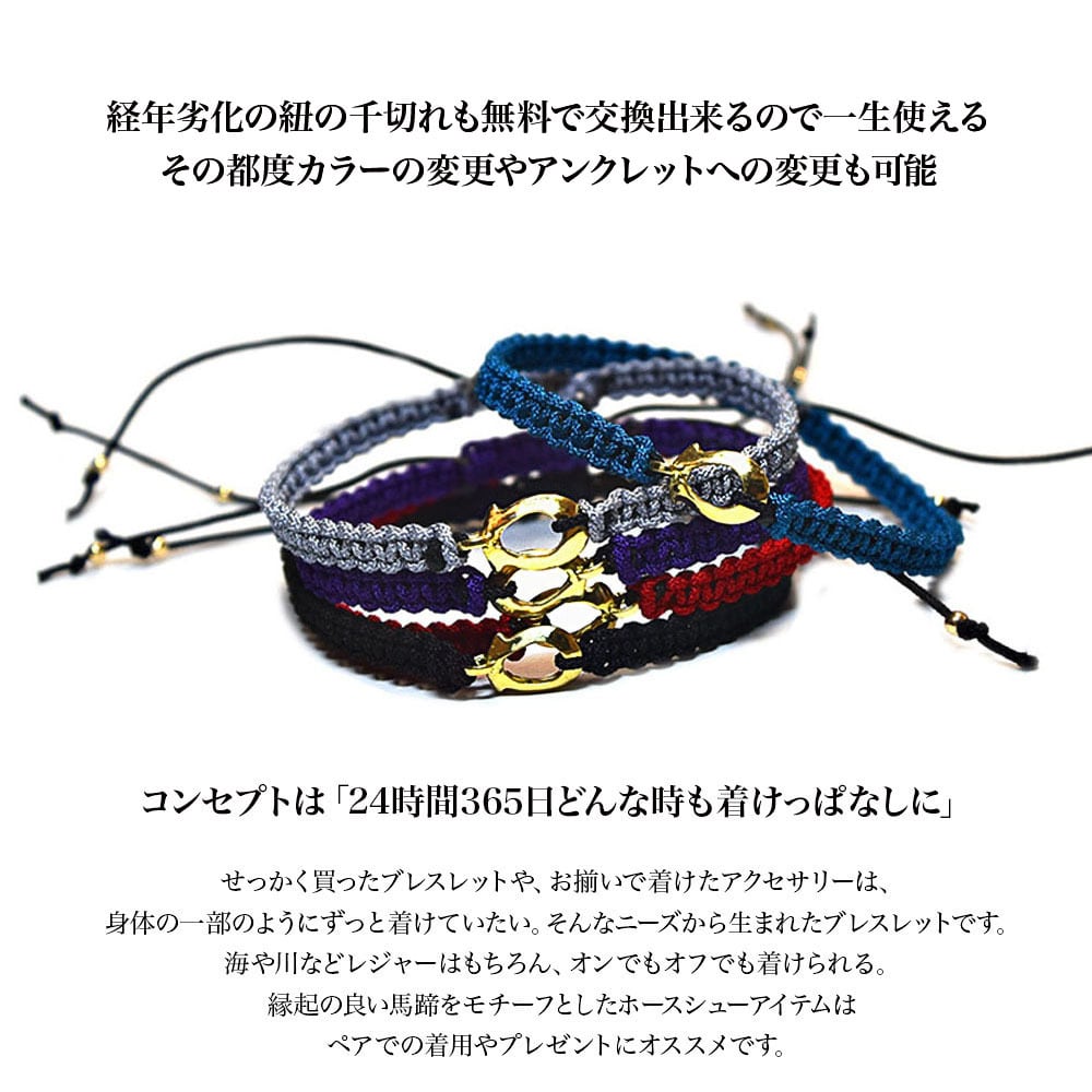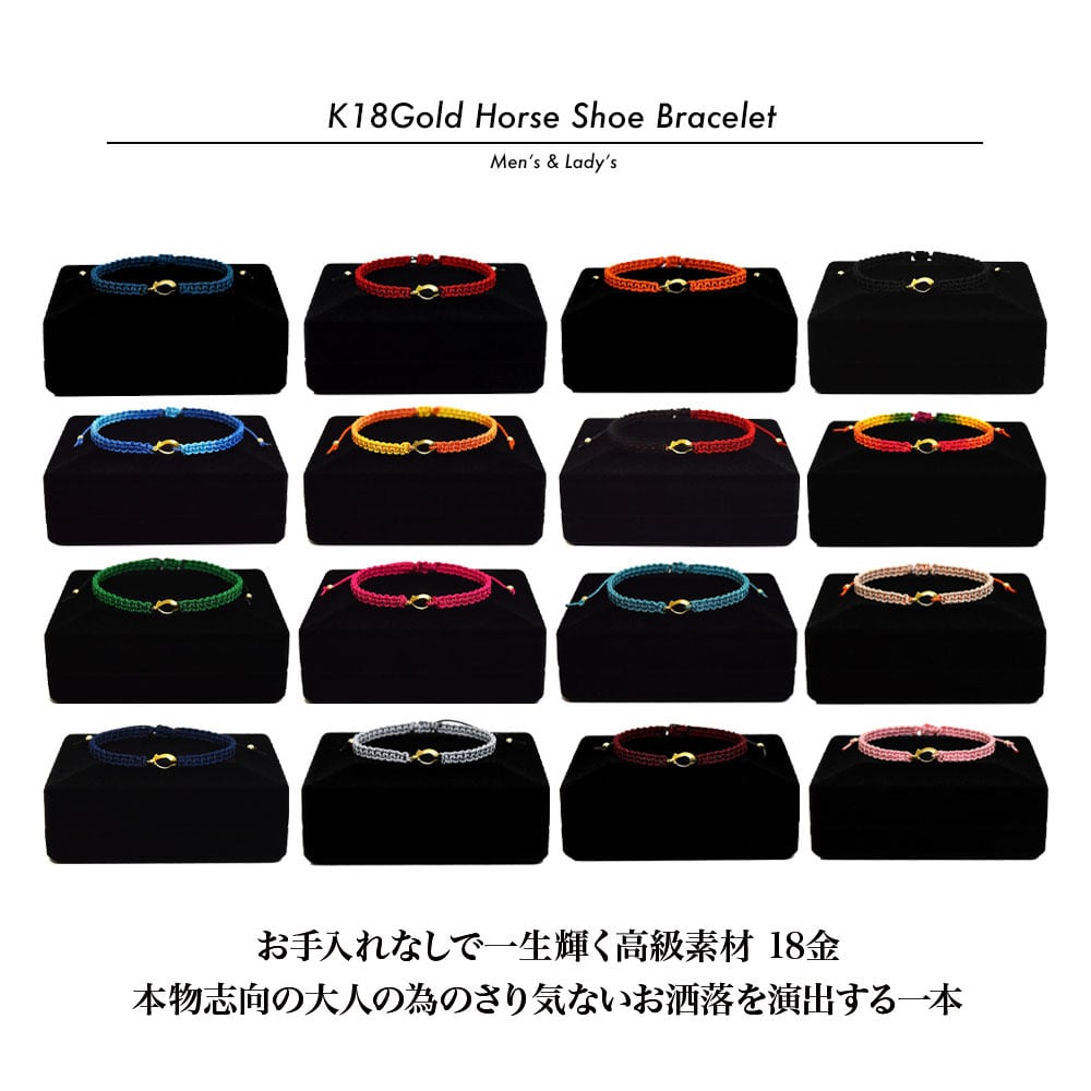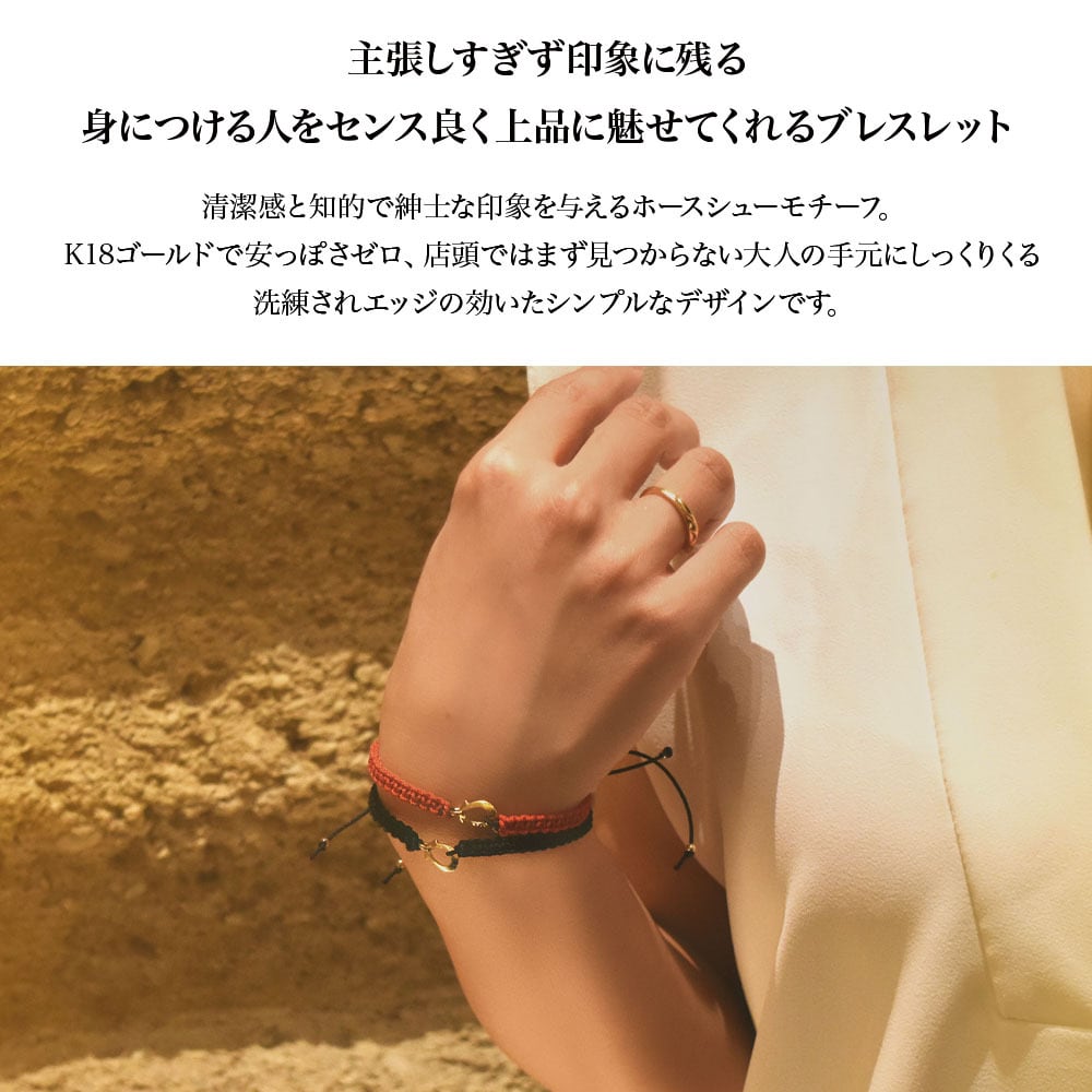 ※【納期につきまして】 こちらの商品はご注文の確認より約2〜3営業日程で発送致します。 土日祝はお休みですが、発送は行っており、ご注文は随時承っております。 ご了承頂けましたら幸いです。 【お手入れなしで一生輝く高級素材 18金】 18金は純金75%の高級素材。本物志向の大人の為のさり気ないお洒落を演出する一本になります。 経年劣化など、もしコードが切れてもお直し代無料で交換できるので一生使える! 【主張しないのに印象に残る、身に着ける人をセンス良く上品に演出】 清潔感と知的で紳士な印象を与えるホースシューモチーフ。 K18ゴールドで安っぽさゼロ、店頭ではまず見つからない大人の手元にしっくりくる洗練されエッジの効いたシンプルなデザインです。 【プレゼント満足度No.1のホースシューアイテム!】 男女共に幅広い層から支持されるモチーフ。 大人向けモチーフですので30代40代の方には特にオススメです。 男性だけでなくペアでの着用や女性にもピッタリの上品なホースシュー。 専用ケース、ポーチ付きでプレゼントにも好評価を頂いている商品です。 【24時間着用可能で海でもお風呂でも毎日つけっぱなし!】 せっかく買ったブレスレットはずっと着けていたいし、もちろん海やフェスなどのレジャーでも活用したい!という願望を叶える為に開発されたブレスレット。 高級金属のK18ゴールドをチャームに採用し、海やプール、シャワーなど、24時間着けっぱなしでもOKです。 コードは水や汗に強く、耐久性に優れた日本製のポリエステルコードを、職人の手によって全て手作業で編み込み、さらに強度を上げております。 【ご購入後のカラーやサイズの変更も無料!】 気分や季節に合わせてカラーの変更や、夏はアンクレット(同じチャームを使用しているK18Gold Horse Shoe Anklet)、冬はブレスレットに変更という使い方も可能に!カラーは引き継ぐ事も可能! 小さめのゴールドチャームですので安っぽくならず、サラッと着けてさりげなく手元を主張できます。酸化による変色もないのでいつまでもキレイな美しい状態で着用して頂ける高品質アクセサリー。 蹄鉄とも呼ばれる馬蹄はヨーロッパでは幸運のモチーフとして玄関先に飾られているだけでなく、日本でも「ウマくいく」として必勝祈願や、馬の蹄鉄を「滑らない」として合格祈願としても人気のモチーフです。 大きな試験を受けられる方への応援アイテムとしてのプレゼントにもオススメ! フリーサイズ展開ですのでサイズ選びで苦戦するプレゼントにもオススメ。 直営目玉商品として価格もリーズナブルに抑えた、メゾン ド ノービリスが自信を持ってオススメする人気商品です。 ◆素材 / チャーム部分 K18ゴールド/コード部分 ポリエステル100% / ビーズ部分 K14GFD ◆太さ / 5mm (0.8mm日本製コードを使用) ◆製作国 / 日本 ◆付属 / ギャランティーカード(保証書)/アクセサリーポーチ ※ご注文のキャンセルはお受け出来ませんのでご注意ください。交換は随時承っておりますので、ご連絡くださいませ。 ※コードがちぎれたり、チャームの磨き等アフターサービスも承っておりますので、その際は一度お問い合わせくださいませ。 ※フリーサイズですが、メンズとレディースで若干サイズが異なります。ご注意ください。